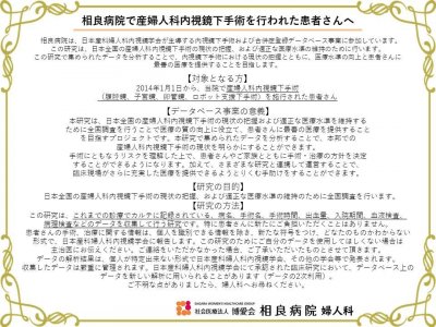 相良病院は、日本産科婦人科内視鏡学会が主導する内視鏡下手術および合併症登録データベース事業へ参加しております。詳細は下記をご覧ください。