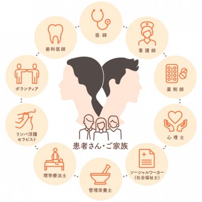 主に治療を担当する主治医に加えて、がんに伴うさまざまな身体症状を緩和する緩和ケア医と精神的ケアを担う精神科医がいます。