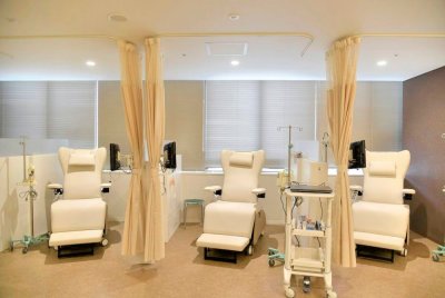 明るくゆったりとしたセンター内には、ベッド6床、リクライニングチェア6席を完備。それぞれにプライバシーを確保するカーテンと液晶テレビ、イヤフォン等が設置され、リラックスして治療を受けられる雰囲気です。