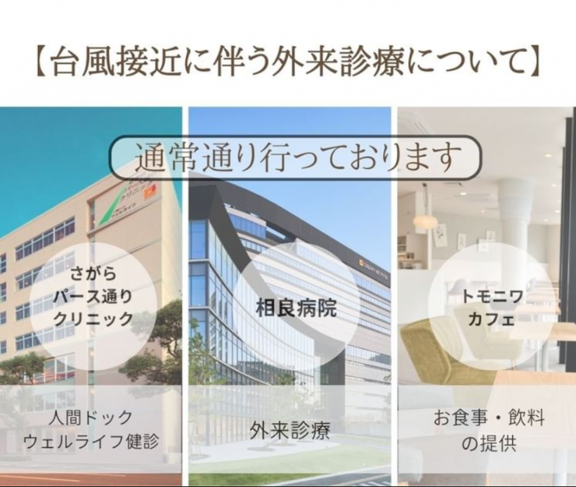 台風接近に伴う外来診療について 大型でゆっくりとした速度で台風が接近しております。 相良病院・さがらパース通りクリニック・人間ドック ウェルライフは通常通り診療を行っております。 ご来院の際は、公共交通機関の状況や道路事情等をご確認の上、慎重にご判断くださいませ。