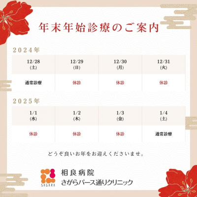 【お知らせ】年末年始の診療について 2024年12月29日(日)~2025年1月3日(金)は、相良病院・さがらパース通りクリニックは外来診療を休診させていただきます。 診療の休診期間中は、立体駐車場のご利用も休止となります。 また、トモニワカフェもお休みをいただきますので、あらかじめご了承ください。 なお、2025年1月4日(土)より通常診療となります。