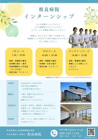 現在、2025年度4月入職の看護師の募集要項を公開しております。応募を前に3月以降、インターンシップにご参加いただくことも可能です。またあわせて、経験者の中途採用も行っております。
