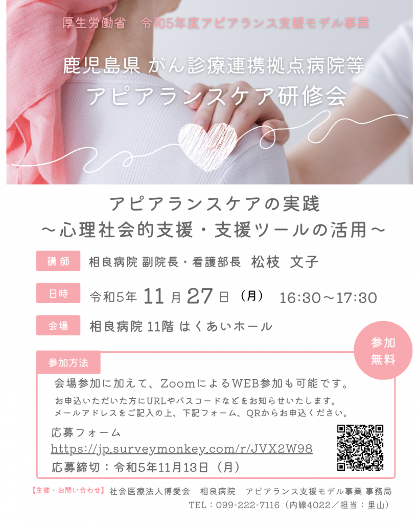「令和5年度アピアランス支援モデル事業」の一環として、11月27日(月)に『アピアランスケア研修会 アピアランスケアの実践〜心理社会的支援・支援ツールの活用〜』を開催いたします。