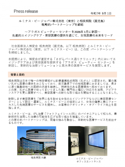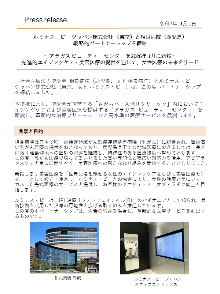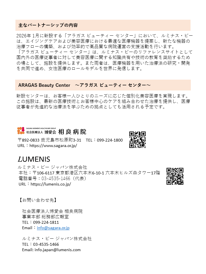 【ニュースリリース】ルミナス・ビージャパン株式会社と相良病院 戦略的パートナーシップを締結 ~2026年1月アラガスビューティーセンターを新設~ 先進的エイジングケア・美容医療の提供を通じて、女性医療の未来をリードします。 ニュースリリースPDF ルミナス・ビージャパン株式会社