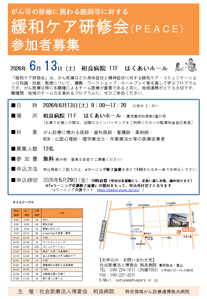 【PEACE2026】6/13(土) がん等の診療に携わる医師等に対する緩和ケア研修会