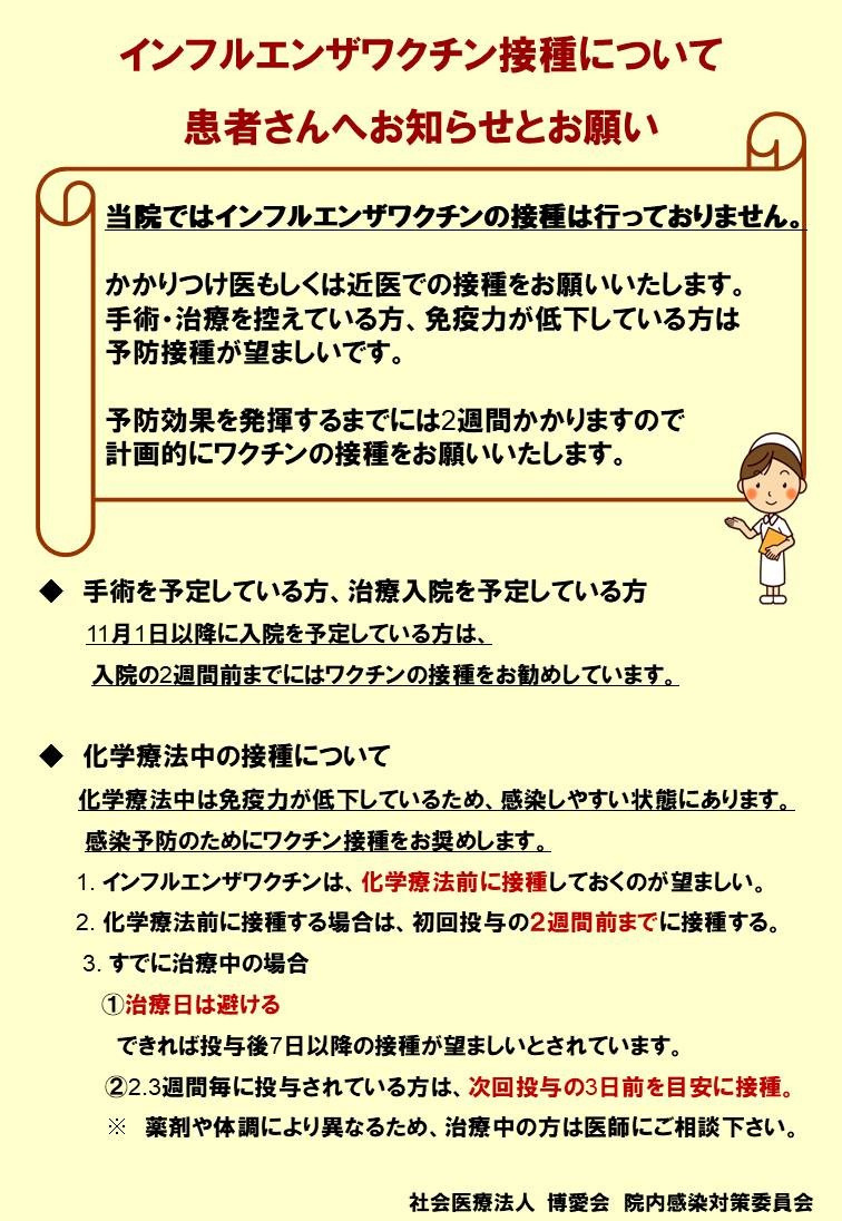11月1日以降に入院を予定されている方は、入院の2週間前までのワクチン接種をおすすめしています。