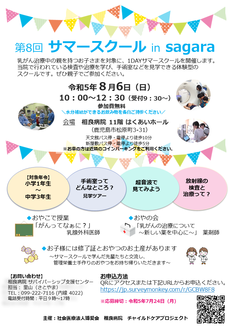 【申込受付終了】サマースクール in sagara 乳がん治療中の親を持つお子さまを対象に、手術室などを見学したり検査や治療について学べる体験型の1Dayサマースクールを開催します。ぜひ、親子で参加してみませんか? 日時 2023年8月6日(日) 10:00~12:30 参加対象 小学1年生~中学3年生 申込方法 申込受付は終了しました。 お問い合わせ 099-222-7116(内線:4022) 平日9時~17時 ※電話はダイヤルインのため、発信音がしたら内線4022をプッシュしてください。担当者につながります。