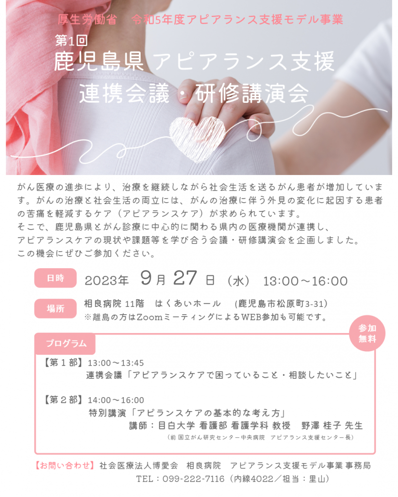 同事業の一環として、「第1回鹿児島県アピアランス支援連携会議・研修講演会」を9月27日(水)に実施いたします。この機会にぜひご参加ください。