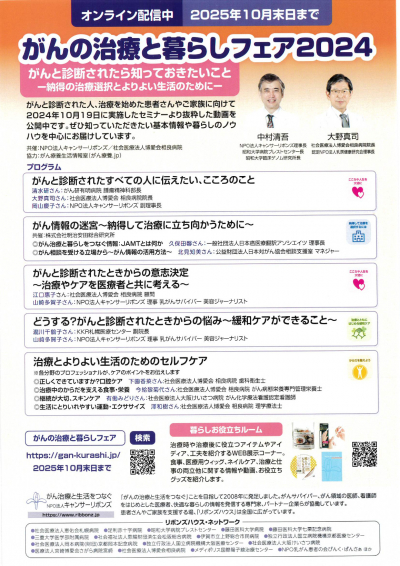 2024年10月19日に実施した「がんの治療と暮らしフェア2024」のセミナー動画が公開されました。