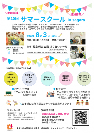 8月3日(日)に「第10回 サマースクール in sagara」を開催しました。当院のサマースクールは、乳がん治療中の親を持つ小中学生のお子様を対象とした半日体験型のイベントです。