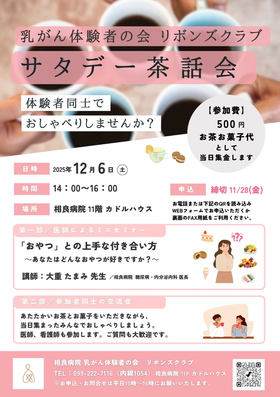 相良病院 乳がん体験者の会 リボンズクラブでは、患者さん同士で語り合える「サタデー茶話会」を開催します。3度目となる今回は、相良病院 糖尿病・内分泌内科の大重たまみ先生を講師にお迎えして、おやつの賢い食べ方についても学びます。
