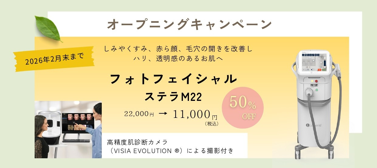 オープニングキャンペーンとして、フォトフェイシャルステラM22を初めて受けられる方限定で、50%OFFでご提供します。