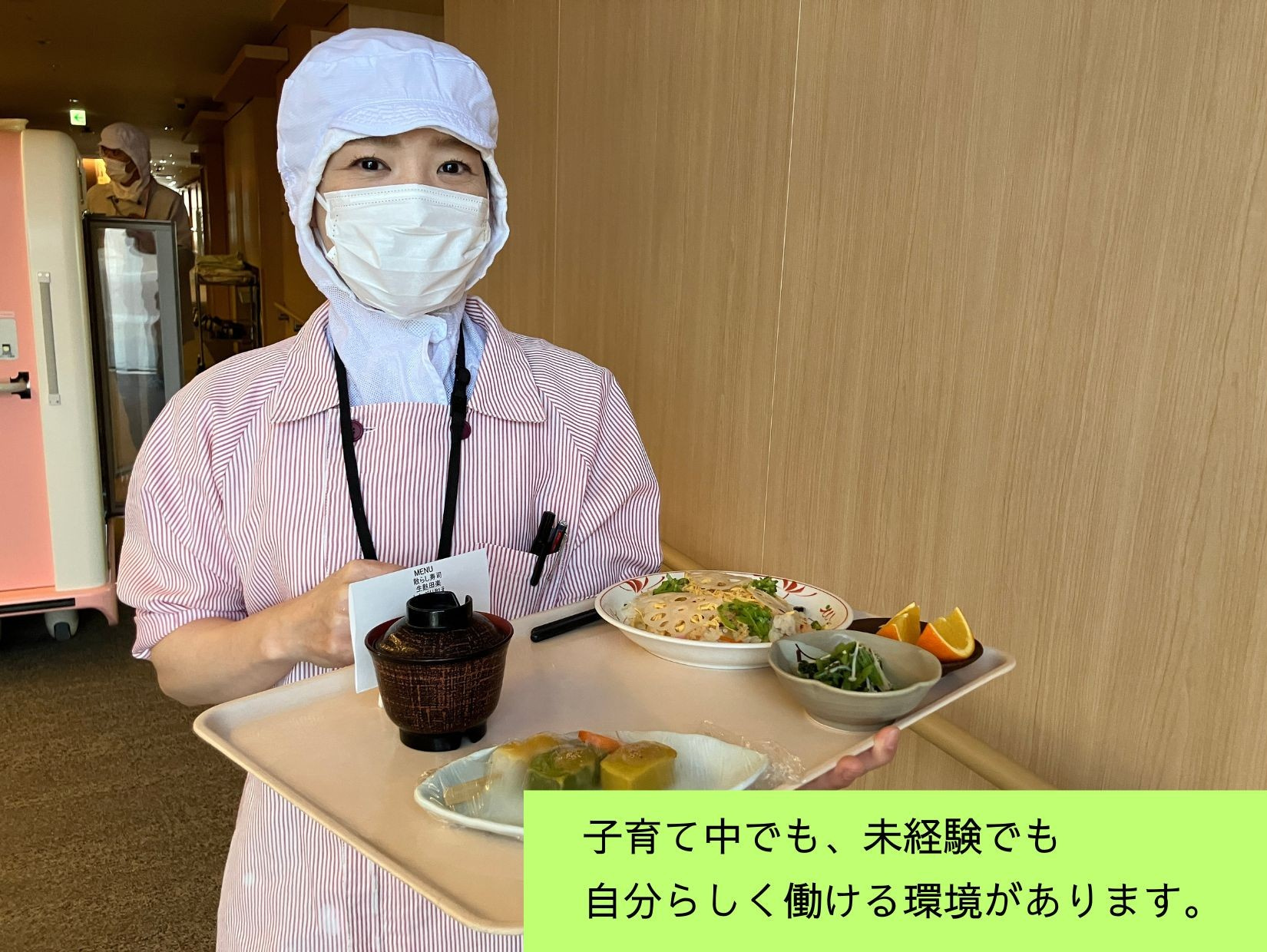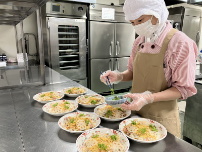 現在は、患者さんと保育園の食事を盛り付けできるようになり、9:30から18:00までの日勤で働いています。食欲がない方でも箸が進むような美味しく綺麗な盛り付けを目指していきたいと日々奮闘しています。