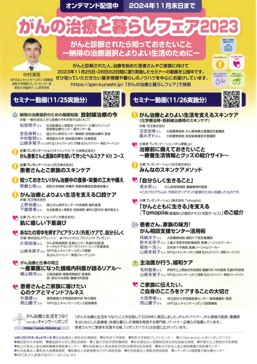 がんと診断された方、治療を始めた患者さんやご家族に向けて、2023年11月25日・26日の2日間にわたり実施されたセミナーの動画が公開されています。