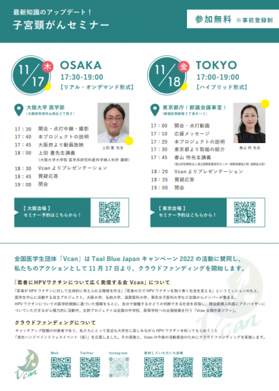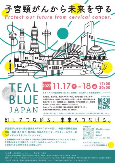 「TEAL BLUE JAPAN キャンペーン」は、子宮頸がん検診の受診啓発とHPVワクチンの正しい知識の理解促進を目指して、世界保健機関(WHO)が主催する「子宮頸がん撲滅 世界一斉イルミネーション」と連動し日本のランドマークをティールブルーにライトアップするプロジェクトです。