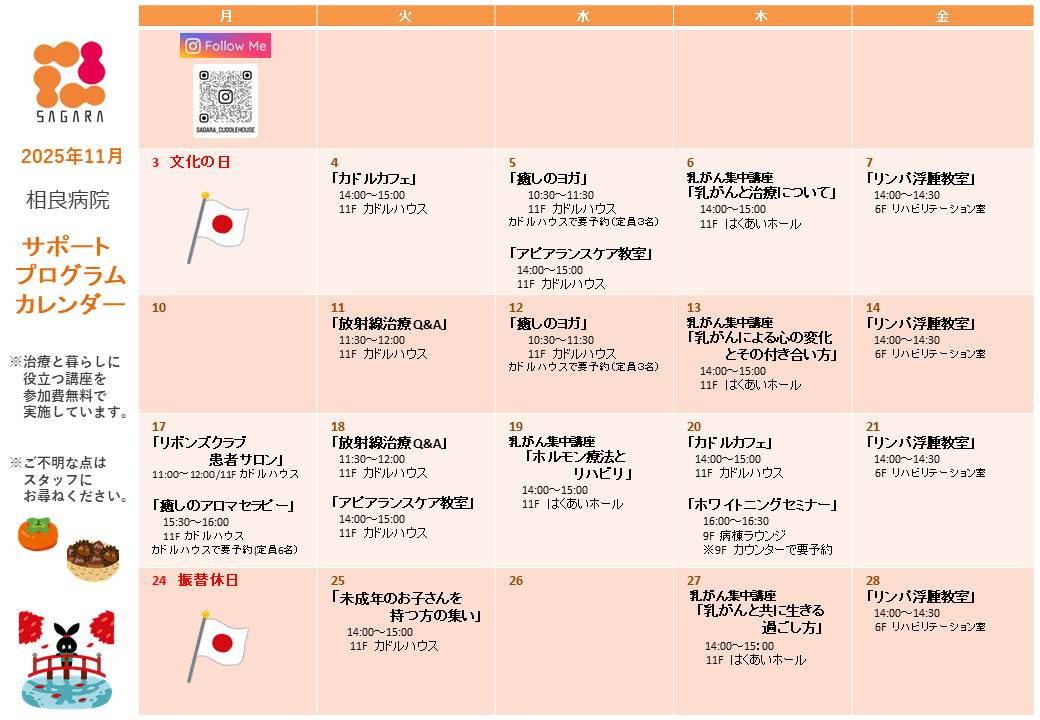 - 「癒しのヨガ」「癒しのアロマセラピー」「ネイルケア」「ホワイトニングセミナー」は、入院患者さん限定のプログラムです。