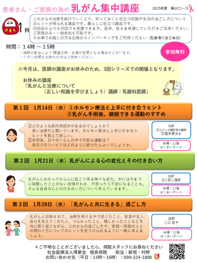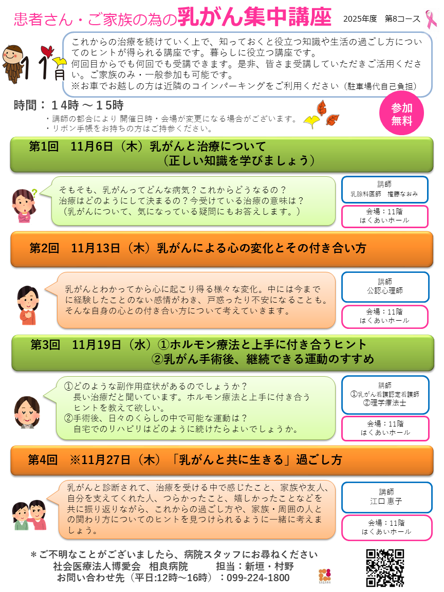 博愛会では、患者さんがご自身の病気や対処法についてよく知り、心にゆとりを持って日々を過ごせることを願い、『乳がんと上手に付き合い、生活していくための治療プログラム』を構築しています。その一環として、患者さんとご家族を対象に年間を通して学習会を企画しています。