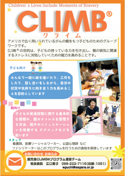 「CLIMB®プログラム」は、アメリカで広く用いられている、がんの親を持つ子どものためのグループワークです。親ががんであることを伝えられている学齢期のお子さんを対象として、ファシリテーターの教育を受けた医療者が開催しています。