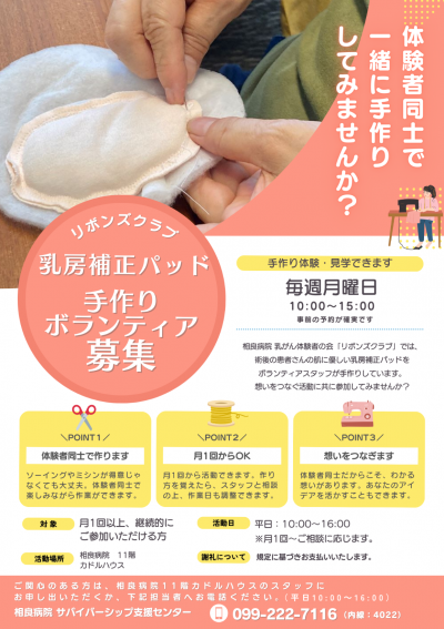 術後の患者さんの肌に優しい乳房補正パッドを、一緒に手作りしてくださるボランティアスタッフを募集しています。