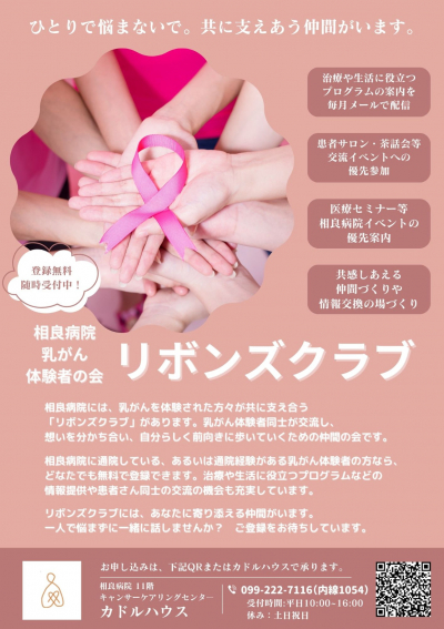 相良病院には、乳がんを体験された方々が共に支え合う「リボンズクラブ」があります。乳がん体験者同士が交流し、想いを分かち合い、自分らしく前向きに歩いていくための仲間の会です。