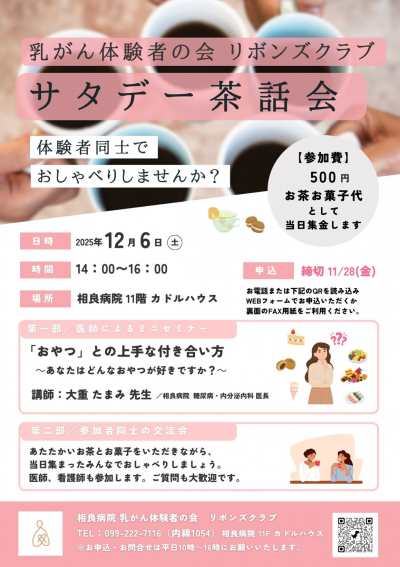 2025年12月6日(土)に体験者同士で語り合える茶話会を開催します。3度目の開催となる今回は、相良病院 糖尿病・内分泌内科の大重たまみ先生を講師にお迎えして、「おやつ」の賢い食べ方について学びます。